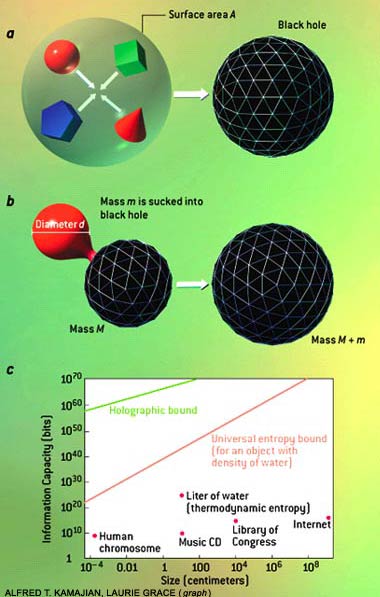 THE THERMODYNAMICS OF BLACK HOLES allows one to deduce limits on the density of entropy or information in various circumstances. The holographic bound defines how much information can be contained in a specified region of space. It can be derived by considering a roughly spherical distribution of matter that is contained within a surface of area A. The matter is induced to collapse to form a black hole (a). The black hole's area must be smaller than A, so its entropy must be less than A/4 [see illustration]. Because entropy cannot decrease, one infers that the original distribution of matter also must carry less than A/4 units of entropy or information. This result--that the maximum information content of a region of space is fixed by its area--defies the commonsense expectation that the capacity of a region should depend on its volume. The universal entropy bound defines how much information can be carried by a mass m of diameter d. It is derived by imagining that a capsule of matter is engulfed by a black hole not much wider than it (b). The increase in the black hole's size places a limit on how much entropy the capsule could have contained. This limit is tighter than the holographic bound, except when the capsule is almost as dense as a black hole (in which case the two bounds are equivalent). The holographic and universal information bounds are far beyond the data storage capacities of any current technology, and they greatly exceed the density of information on chromosomes and the thermodynamic entropy of water (c).